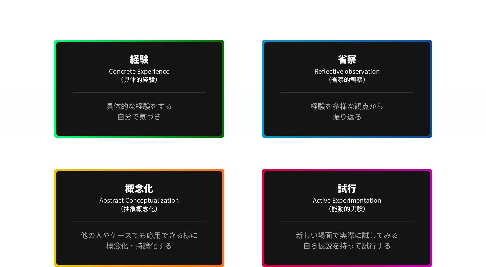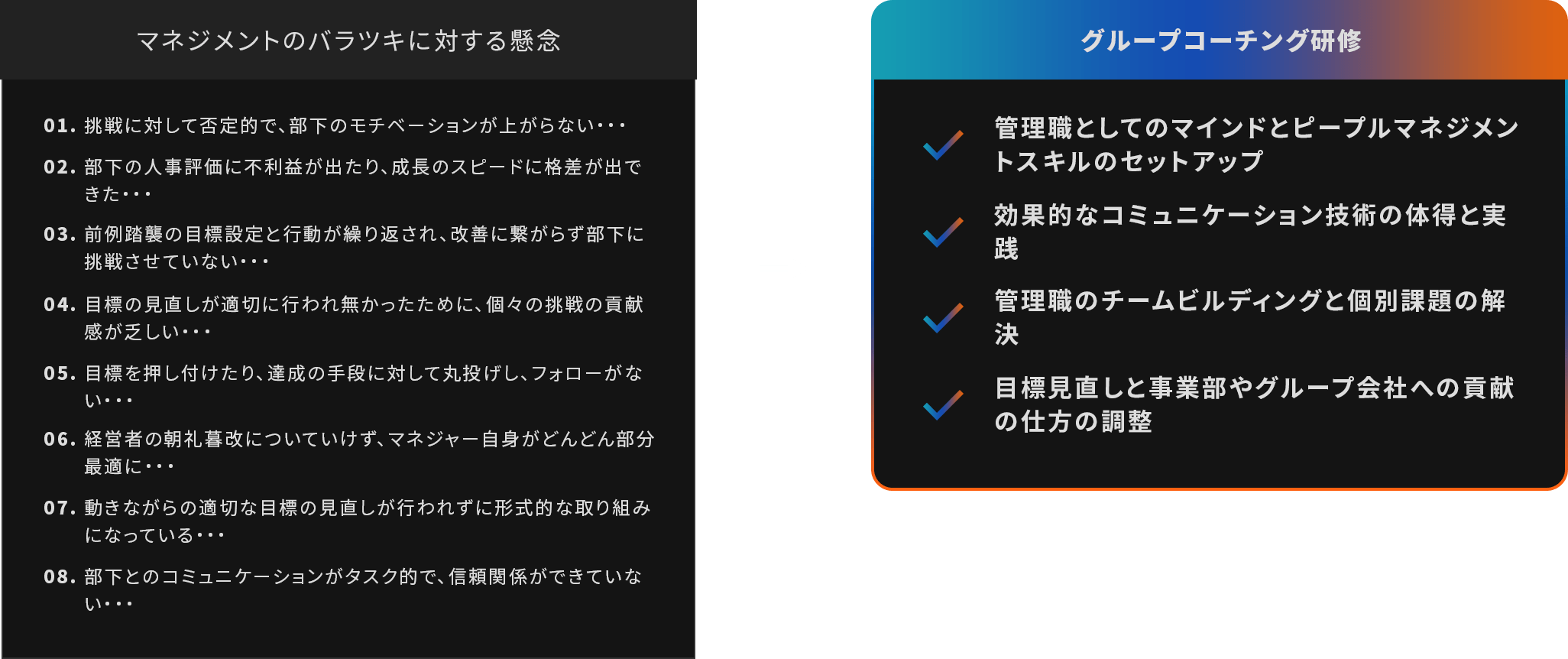 乖離は①起きた出来事を自分自身の未来に対して意味づけできていない②自分自身の特性理解が低く、求められる行動を“自分らしいやり方で発揮すること”を理解できていない、この2つに起因することが多いです。①は経験学習モデルをもとに日々貴社の現場で頻出する課題をテーマに、“求められる行動を実際に発揮する、そこから自分にとっての意味を抽出する”ことを軸にしたオンサイト・オフサイト環境でのトレーニングを提供します。②アセスメントツールをもとに、自身の特性理解とその特性を活かした効果的な言動・行動の方法を実践するトレーニングを提供します。