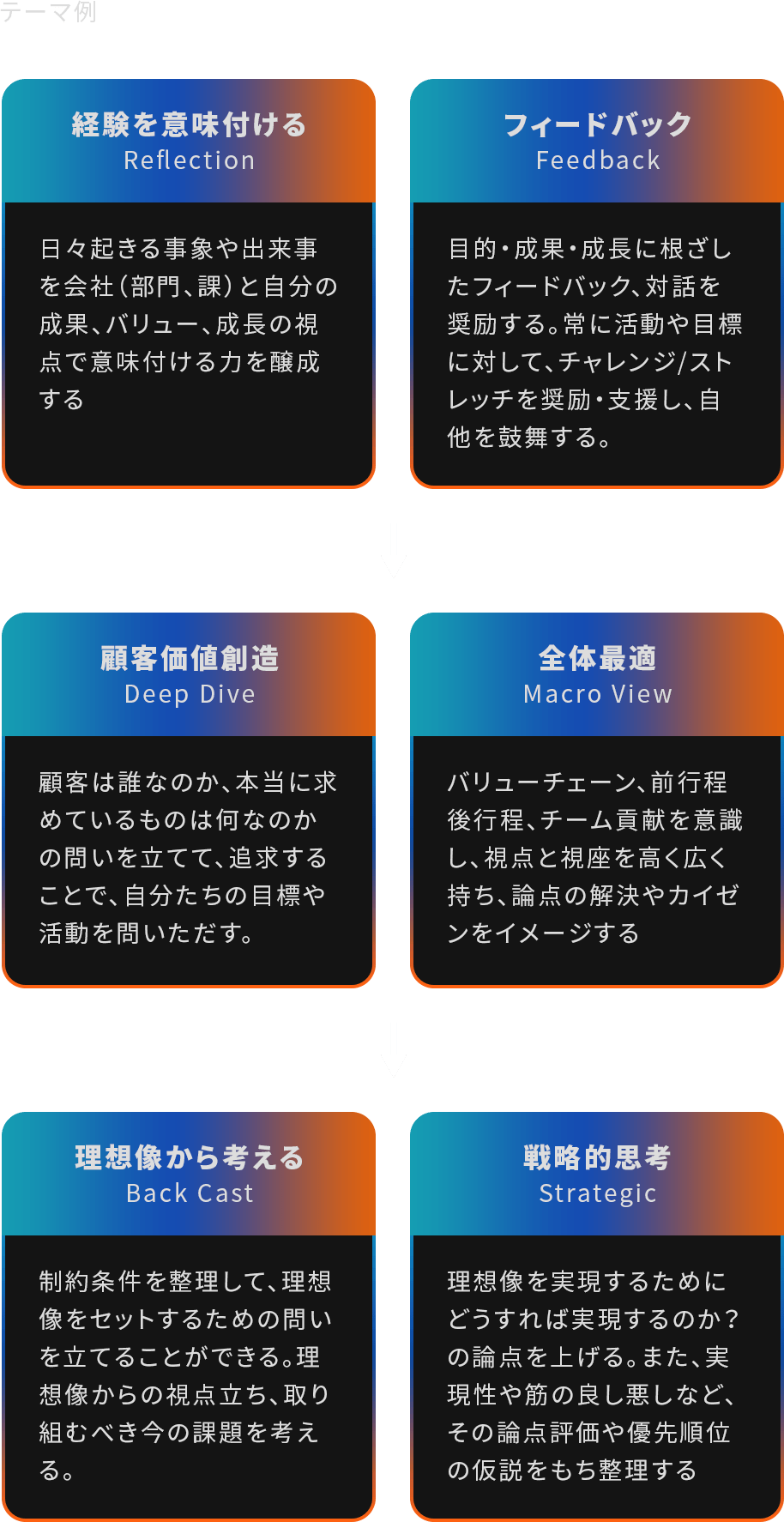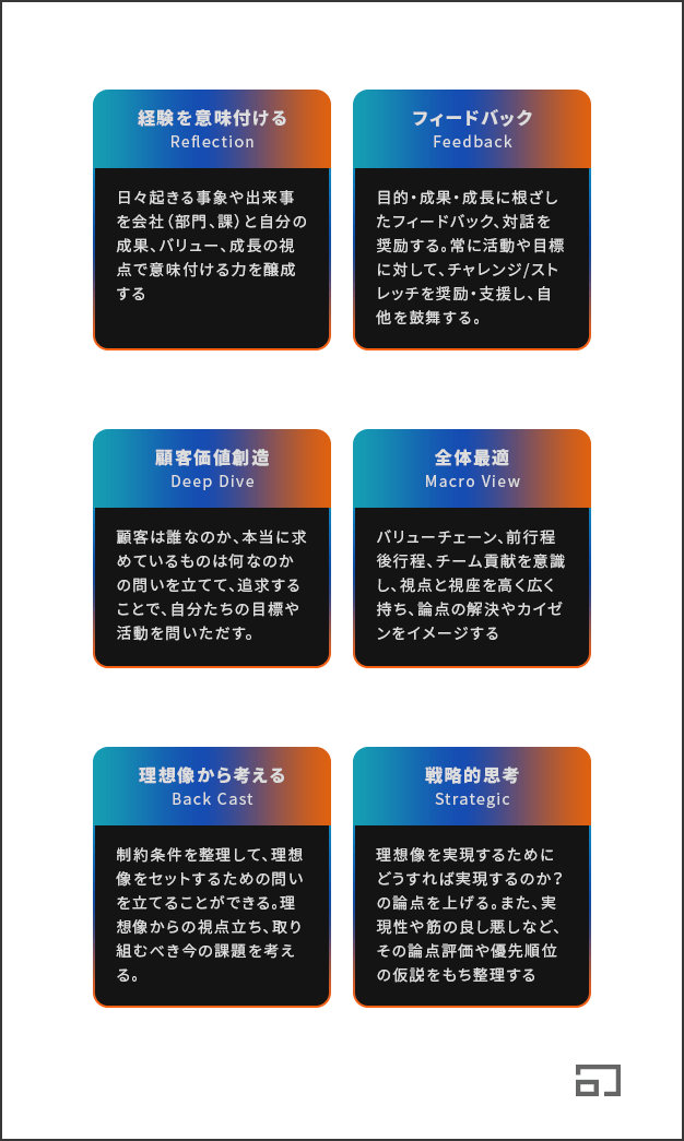 コア人材として求められる能力に対して適切なテーマを設定し、それに対して自ら考え自ら実践し、相互の本気・本音のフィードバックを通して、経営から期待される思考・行動の定着を図ります。